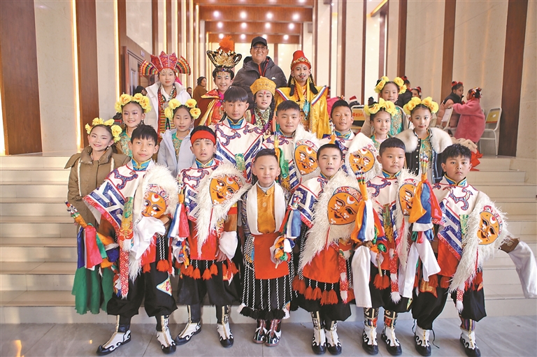 圖為中普瓊和自治區(qū)群藝館(區(qū)非遺保護(hù)中心)少兒藏戲班演出學(xué)生合影?!?/p>
