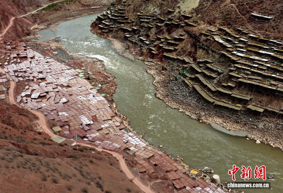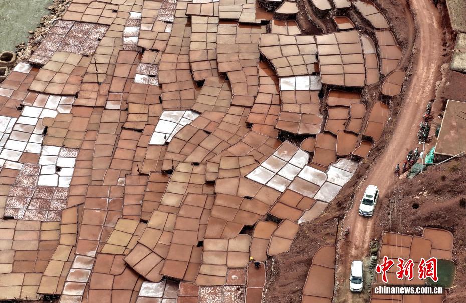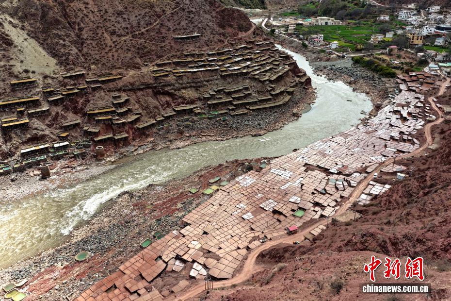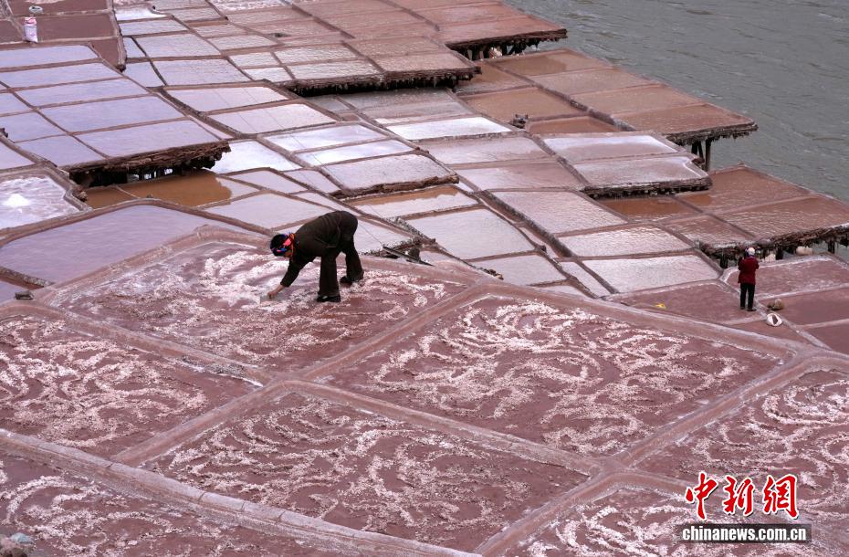 3月24日,西藏昌都市芒康縣境內(nèi)的千年古鹽田猶如大地藝術(shù)畫卷。瀾滄江畔,數(shù)千塊鹽田錯(cuò)落分布兩岸。當(dāng)?shù)孛癖娮裱爬蟼鹘y(tǒng),引水曬鹽,距今已有1300多年的歷史。圖為當(dāng)?shù)孛癖娫邴}田勞作。中新社記者 李林 攝