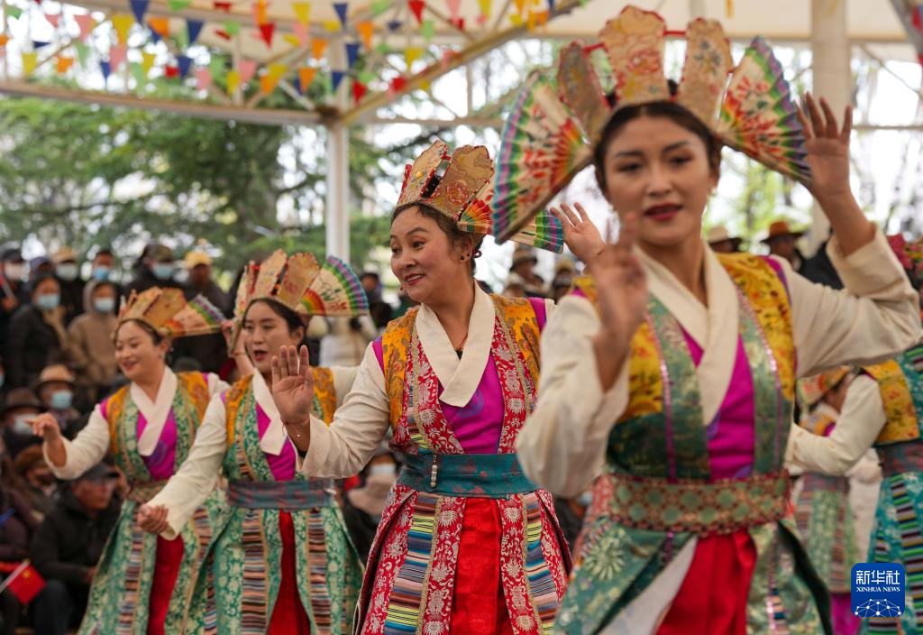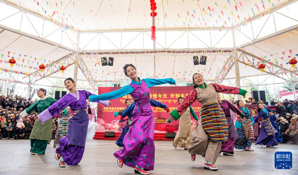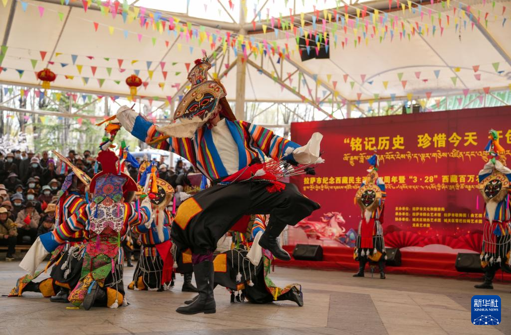 3月28日,演員在拉薩市宗角祿康公園內(nèi)舉辦的西藏百萬農(nóng)奴解放紀(jì)念日群眾演出活動上載歌載舞。新華社記者 丁增尼達 攝