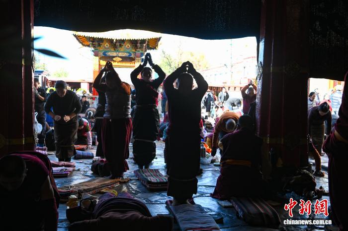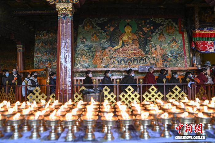 11月28日,西藏拉薩,信眾在大昭寺里排隊(duì)朝拜。西藏進(jìn)入冬季農(nóng)閑期,眾多藏傳佛教信眾從各地匯聚到拉薩,圍繞林廓轉(zhuǎn)經(jīng)路、大昭寺等地轉(zhuǎn)經(jīng)、禮佛、朝拜。中新社記者 貢嘎來(lái)松 攝