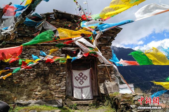 資料圖為位于西藏自治區(qū)山南錯那市勒布溝的倉央嘉措故居,周圍被藏傳佛教信眾掛滿祈福經(jīng)幡。中新社記者 江飛波 攝