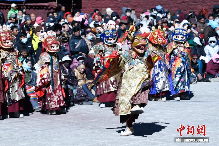 2月16日,西藏楚布寺舉行“羌姆”表演。當日,是藏歷十二月二十九日,西藏楚布寺舉行“羌姆”表演迎藏歷新年。圖為楚布寺僧人們佩戴面具表演。中新社記者 貢嘎來松 攝