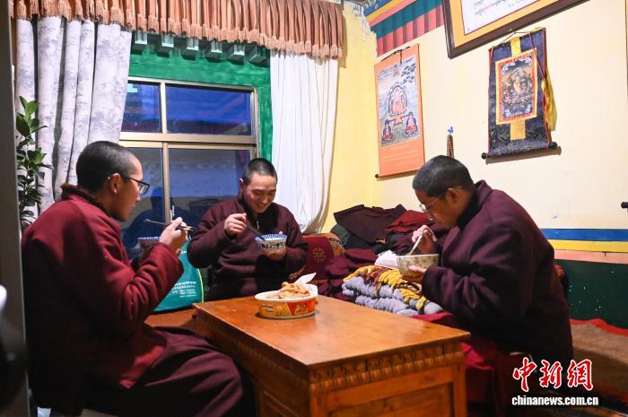 2月16日晚,桑耶寺僧人在“古突”夜吃“古突”,迎接新年到來。中新社記者 趙朗 攝