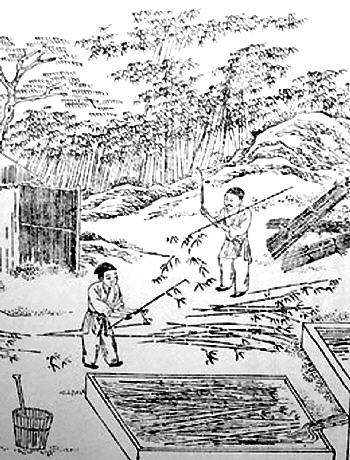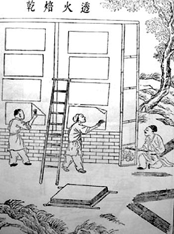 18世紀(jì)末,清乾隆年間由中國畫師手繪的竹紙制造全套工藝流程工筆設(shè)色組畫,由在京的法國耶穌會士蔣友仁寄往巴黎。竹紙制造系列圖共24幅,具有宮廷畫師畫風(fēng),因其兼具藝術(shù)和技術(shù)的雙重價值,在歐洲不斷被人臨摹。現(xiàn)知多套彩色摹本分別藏于巴黎國家圖書館、法蘭西研究院圖書館及德國萊比錫書籍博物館等地。1815年巴黎出版的《中國藝術(shù)、技術(shù)與文化圖說》中公布了其中的13幅,這些圖為后世有關(guān)造紙技術(shù)的專著爭相引用。此組畫重點(diǎn)向歐洲人展示了抄紙竹簾的型制及用法、濕紙人工干燥技術(shù)和植物黏液的使用等。明代宋應(yīng)星的《天工開物》于18世紀(jì)傳到巴黎,1840年法蘭西學(xué)院漢學(xué)教授儒蓮將其中“殺青”(造紙)一章譯成法文,刊于《法蘭西科學(xué)院院刊》上,后又在另一刊物上發(fā)表了有關(guān)“竹紙制造”的論文。