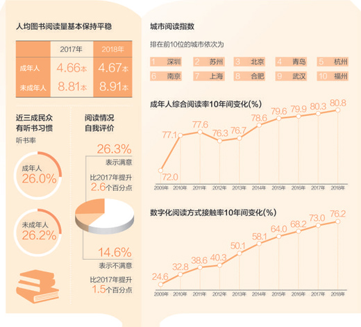 第十六次全國國民閱讀調(diào)查16日在京發(fā)布調(diào)查結(jié)果。數(shù)據(jù)顯示,2018年我國成年人人均紙質(zhì)圖書閱讀量為4.67本,成年人人均電子書閱讀量為3.32本。