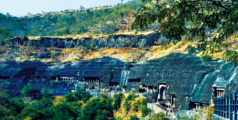 印度阿旃陀石窟鑿于一處馬蹄形暗色巖陡崖上,其形成年代主要分為兩個時期:公元前2世紀(jì)至公元前1世紀(jì)和公元5至6世紀(jì)。它集古代建筑、雕刻、繪畫之大成,融佛教信仰、文化變遷、社會生活于一體,既具有極高的藝術(shù)價值,又飽含深厚的歷史底蘊(yùn)。圖為在印度馬哈拉施特拉邦拍攝的阿旃陀石窟外景。 新華社記者 張迺杰/攝