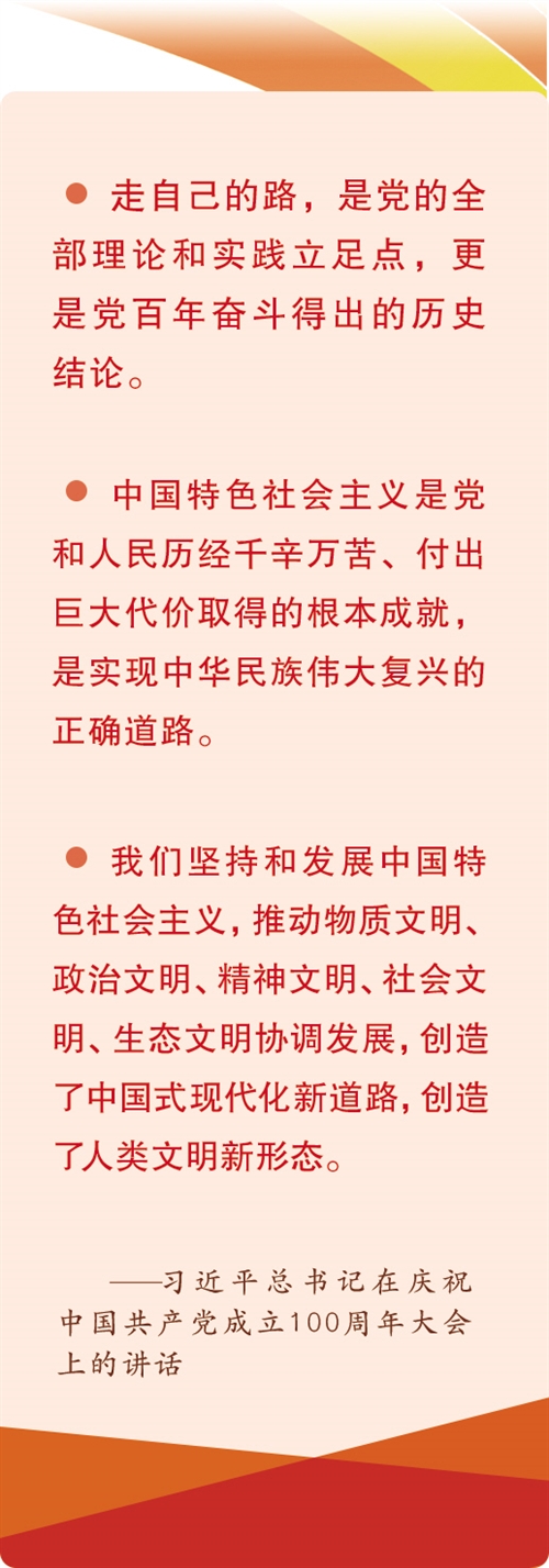 習(xí)近平總書記在慶祝中國(guó)共產(chǎn)黨成立100周年大會(huì)上強(qiáng)調(diào),“以史為鑒、開創(chuàng)未來,必須堅(jiān)持和發(fā)展中國(guó)特色社會(huì)主義”“我們堅(jiān)持和發(fā)展中國(guó)特色社會(huì)主義,推動(dòng)物質(zhì)文明、政治文明、精神文明、社會(huì)文明、生態(tài)文明協(xié)調(diào)發(fā)展,創(chuàng)造了中國(guó)式現(xiàn)代化新道路,創(chuàng)造了人類文明新形態(tài)”。