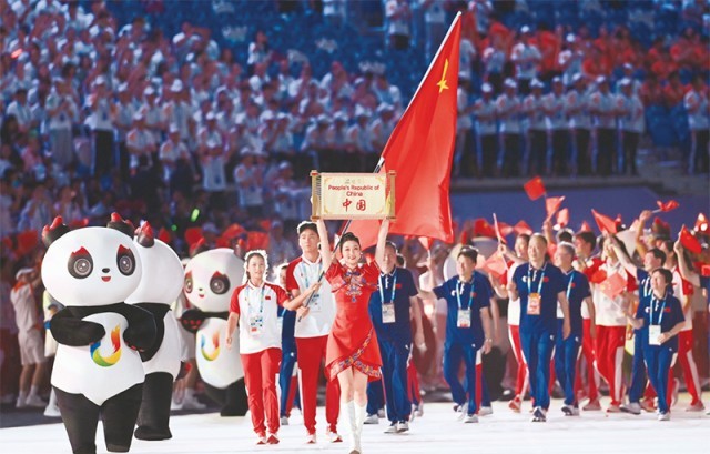 2023年7月28日,第31屆世界大學生夏季運動會開幕式在成都東安湖體育公園主體育場舉行。圖為中國大學生體育代表團在開幕式上入場。 新華社記者 王曦/攝
