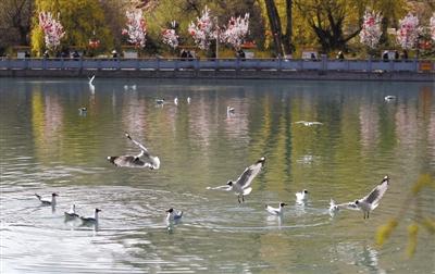 幾只水鳥在拉薩市宗角祿康公園嬉戲。蔣蓋 攝