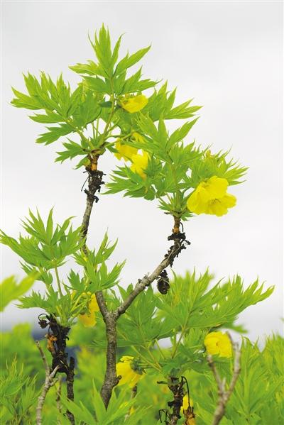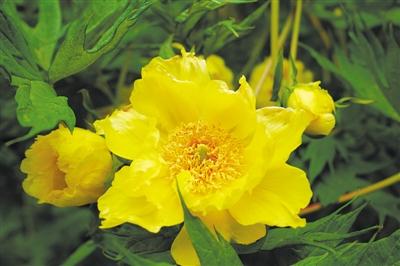 株高一兩米的大花黃牡丹掩映在一片片野生灌木叢中,一點(diǎn)點(diǎn)吸收陽光雨露再綻放出花朵。在片片綠葉的“呵護(hù)”下,大花黃牡丹有的嬌羞待放,有的則花瓣重重疊疊,在陽光下傲然吐露花蕊。