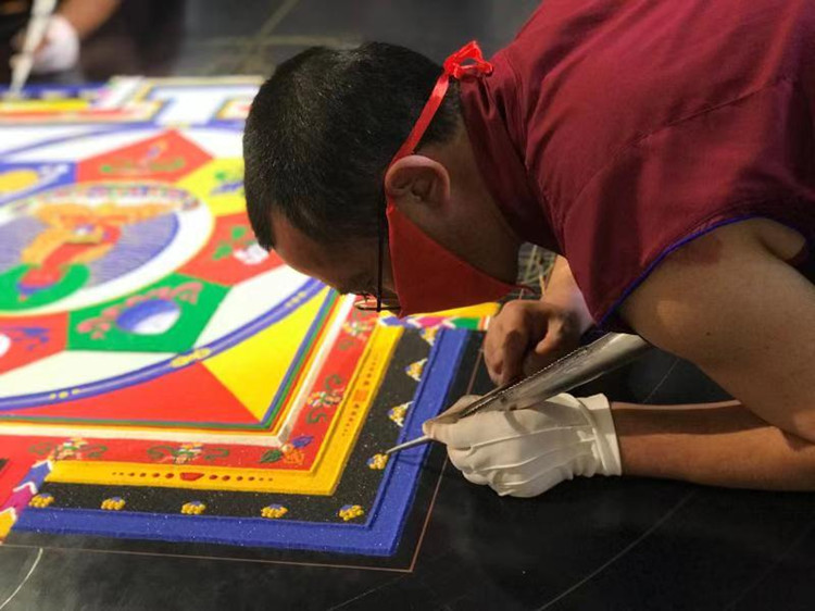 2014年彩砂壇城繪制被列入我國第四批國家級非物質(zhì)文化遺產(chǎn)名錄,它在藏文化中是一種既獨特又精致的藝術(shù)。在泓文博雅,館藏有兩座巨幅壇城沙畫,均由四川省阿壩藏族羌族自治州阿壩縣賽格寺的僧人們繪制而成。