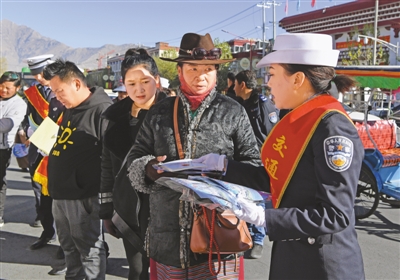 圖為交警同志在民航西藏區(qū)局宣傳點(diǎn)發(fā)放宣傳單并為群眾答疑解惑。記者 洛桑 唐斌 攝
