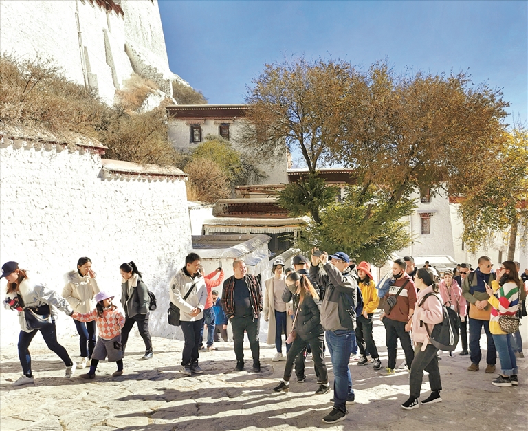 近年來,隨著“冬游西藏·共享地球第三極”活動的舉辦,越來越多的游客選擇在冬季來到美麗的雪域高原,而雄偉的布達拉宮是他們進藏游玩的首選之地,每天排隊參觀布達拉宮的人絡(luò)繹不絕。圖為游客在布達拉宮參觀和拍照留念。記者 梁道燕 攝