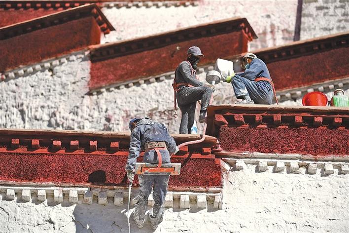 世界文化遺產布達拉宮10月26日起迎來了一年一度的粉刷季,工作人員將用10余天的時間對宮墻、白塔、窗框進行整體粉刷,為布達拉宮美顏。圖為10月28日,施工人員給布達拉宮墻體噴灑涂料。記者 李洲 洛桑 攝