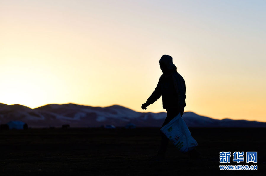 10月28日,在青海省玉樹藏族自治州稱多縣境內(nèi)的嘉塘草原上,生態(tài)管護員扎西才文在撿拾垃圾。新華社記者 張龍 攝