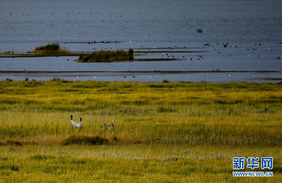 生活在都蘭湖國(guó)家濕地公園內(nèi)的黑頸鶴一家。(9月24日攝)新華網(wǎng) 潘彬彬攝