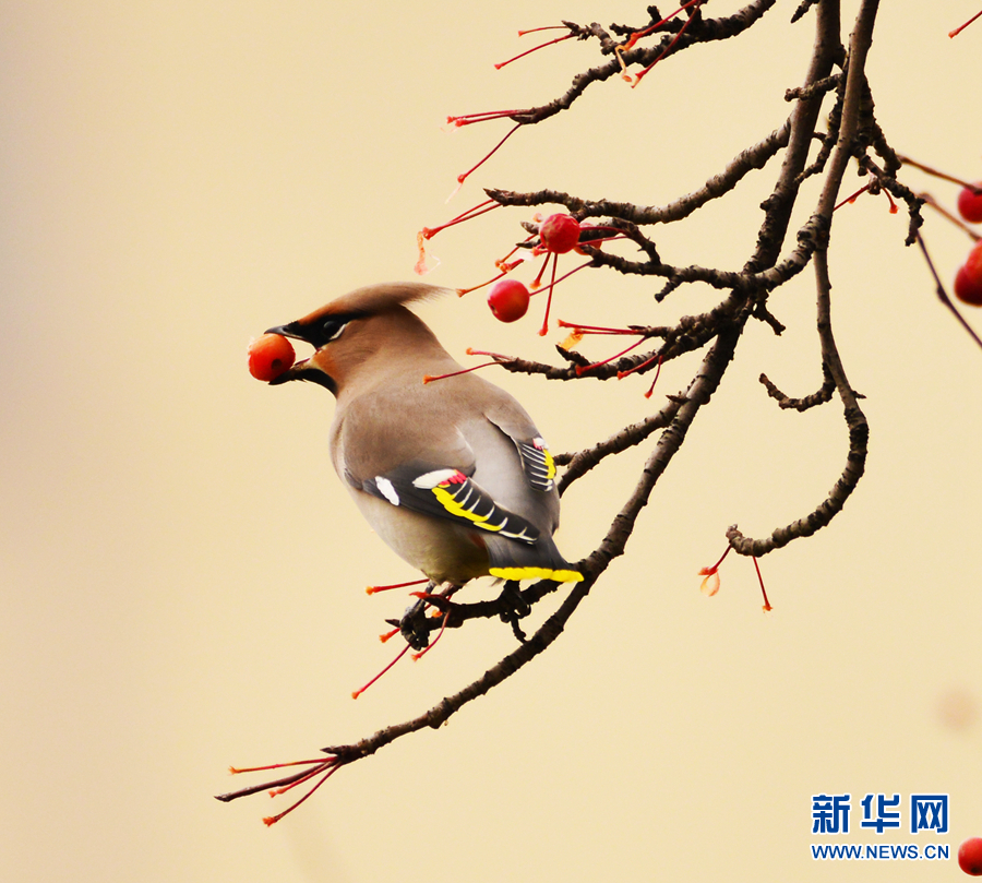 一群太平鳥正在“享用”海棠果。新華網(wǎng)發(fā)(李崇軒攝)