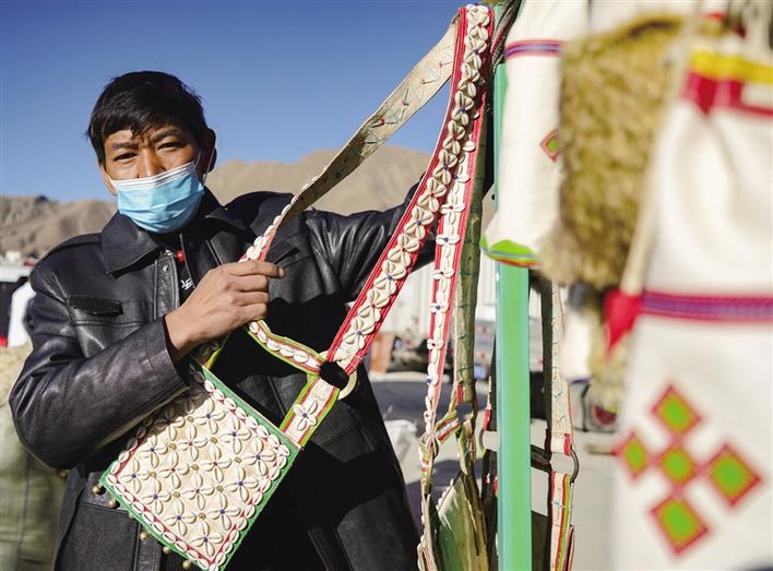 “這個(gè)小包好精致,太好看了?!钡┰龅臄偳皣@著一群人?!澳莻€(gè)最小號(hào)的包還有嗎?”“不好意思,都賣(mài)完了,您看看其他型號(hào)的吧?!眮?lái)自林芝市朗縣的旦增已經(jīng)是第四次參加物資交流會(huì)了,此次物資交流會(huì)他不僅帶來(lái)了核桃、辣椒、蘋(píng)果等當(dāng)?shù)靥厣a(chǎn)品,還帶來(lái)了牦牛皮制作的手工包。