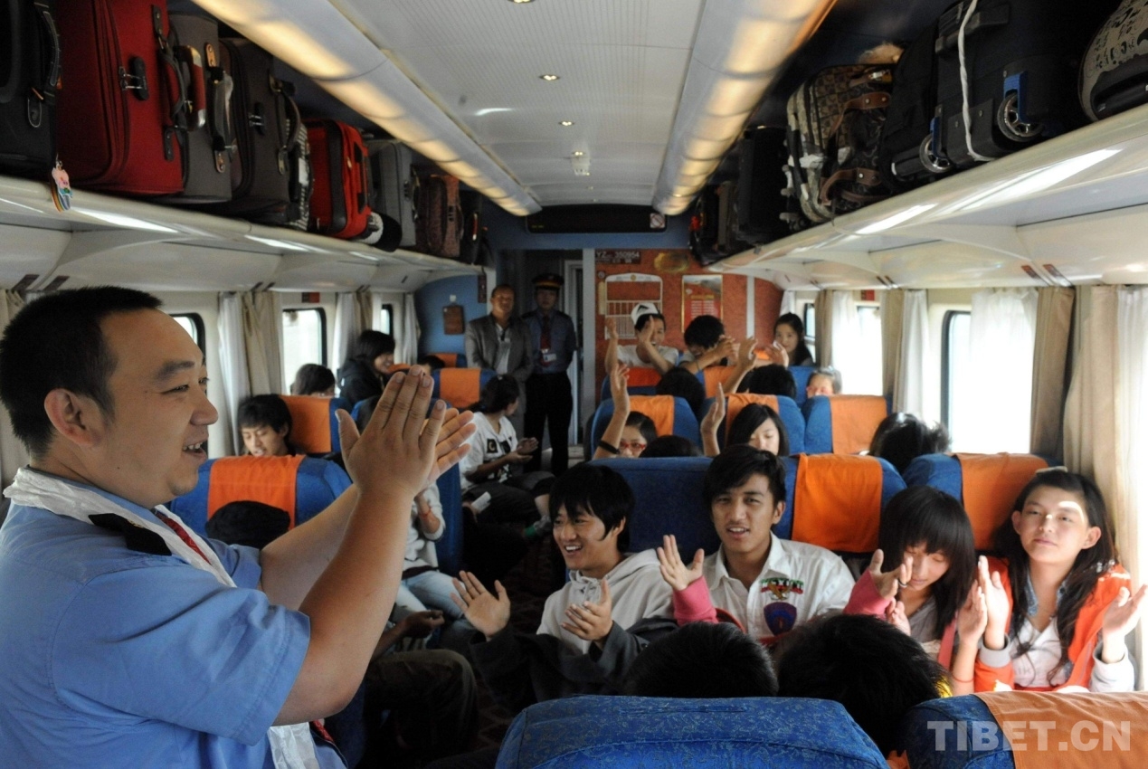 這是被稱為“快樂大叔”的共產(chǎn)黨員、硬座車廂乘務員鄭志剛在北京開往拉薩的京藏列車上,與藏族學生一起歡歌(唐召明2010年7月4日攝)