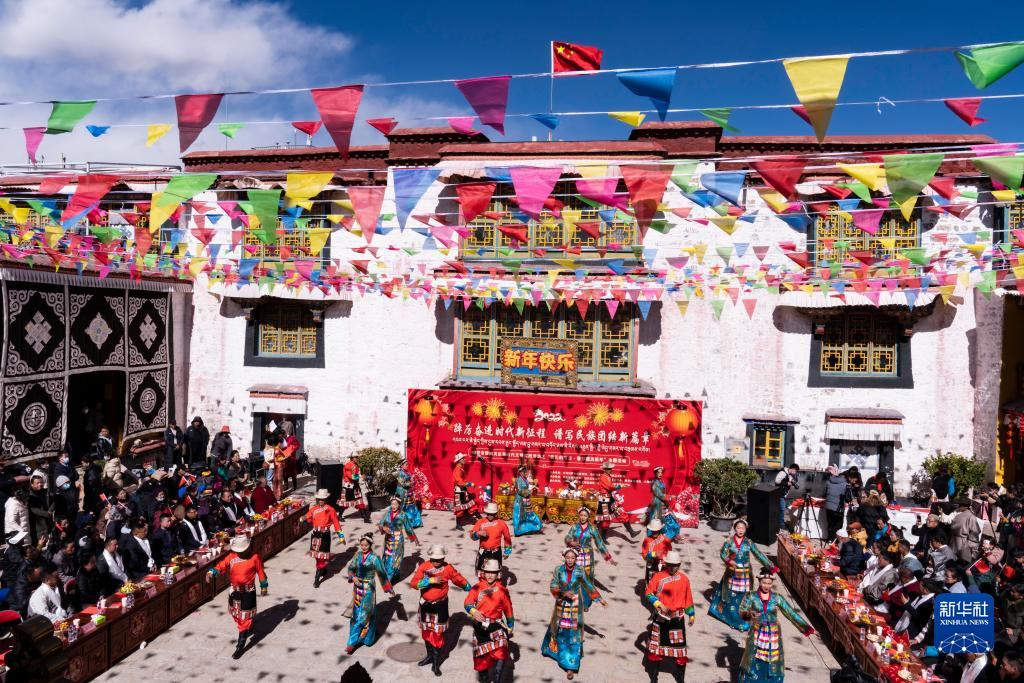 當(dāng)日,西藏拉薩市城關(guān)區(qū)在八廓街老大院夏扎內(nèi)開展迎春節(jié)藏歷新年主題活動(dòng),來自大院附近的多民族居民一起載歌載舞,迎接春節(jié)、藏歷新年。