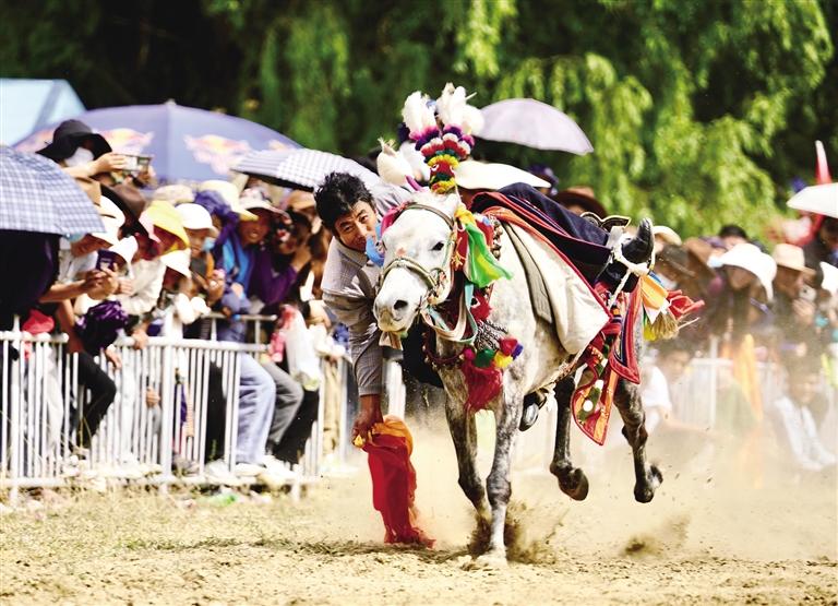 當日上午11時,茶巴朗村望果節(jié)賽馬正式開始,騎手們身著傳統(tǒng)服飾,戴著紅纓帽,身背彎弓,騎著打扮華麗的駿馬,進行了4000米速度賽馬、拾哈達、射箭、馬術等精彩比賽?,F(xiàn)場,觀眾揮舞手臂為選手們鼓勁吶喊。馳騁在賽場上,選手的吆喝聲伴著觀眾的吶喊聲在賽場上空匯聚。