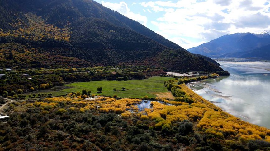 進(jìn)入深秋,西藏多地已飄下皚皚白雪,米林則依然保持著“雪域江南”的底色,在低海拔地區(qū)甚至還可以找到盛開的小花;往上,就是秋的顏色,豐茂的樹林鑲嵌著縷縷金黃,漸次更替;再往上,越來越多的山頂開始戴上“白色的帽子”,這是雪域高原的本色。春夏秋冬好像都在這個(gè)季節(jié)相遇。