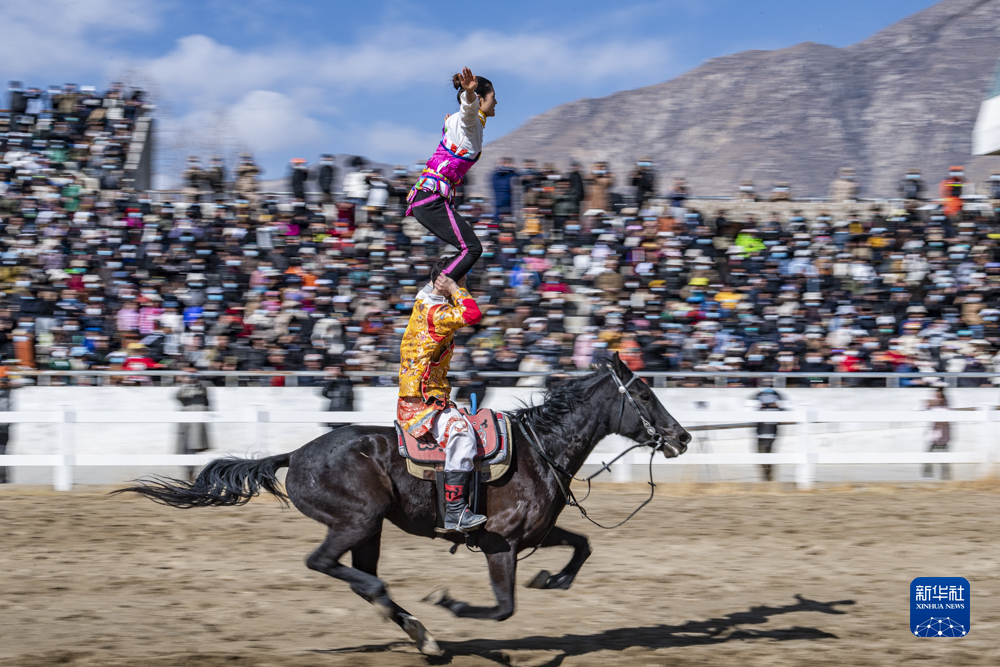 2月23日,騎手進行單人雙馬表演。新華社發(fā)(丁增尼達 攝)