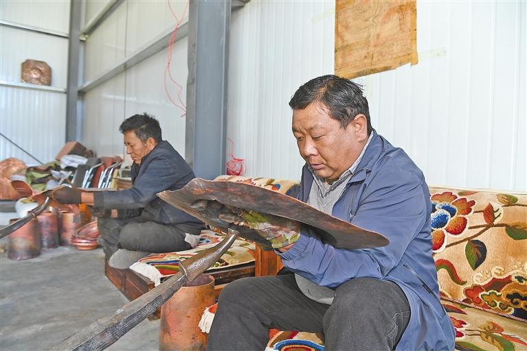 圖為南木林縣孜東銅器的手工藝人在作坊制作工藝品。記者 李洲 攝