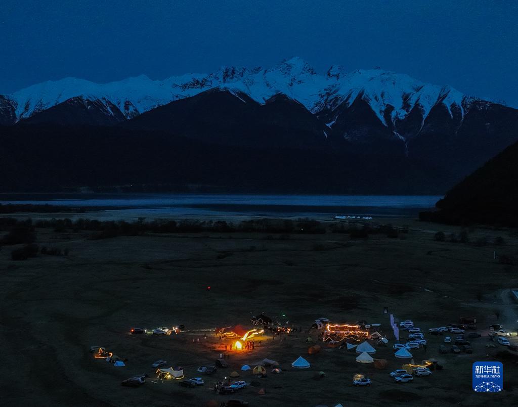 這是4月15日拍攝的“巴松措漂流露營大會”現(xiàn)場,遠處湖泊為巴松措(無人機照片)。新華社記者 孫非 攝