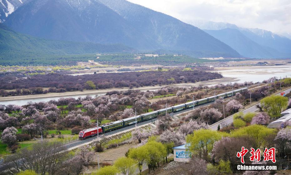 近日,中國鐵路青藏集團有限公司介紹,3月下旬至4月,拉林鐵路沿線綿延的野生桃花林盛開,藍天、白云、桃花、雪山、高原復興號動車等相互交織,形成了一幅幅美不勝收的畫面。圖為穿梭在桃花林中的拉林鐵路高原復興號。