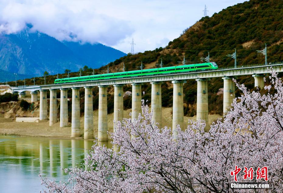 穿梭在桃花林中的拉林鐵路高原復興號。