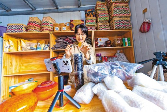 圖為日喀則市吉隆縣吉隆鎮(zhèn)吉甫村村民朗薩通過(guò)電商平臺(tái)銷售當(dāng)?shù)靥禺a(chǎn)。記者 格桑吉美 攝