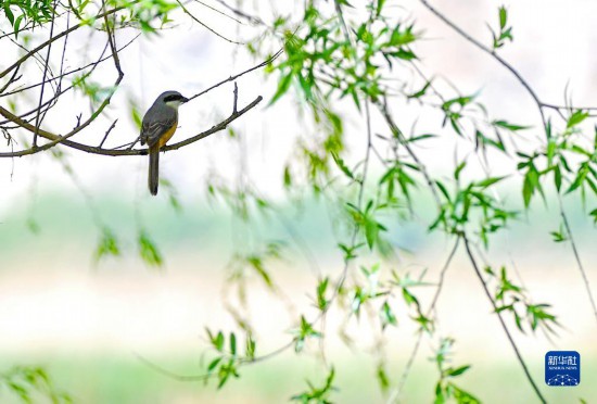 拉魯濕地樹枝上一只四處觀望的灰背伯勞(5月6日攝)。新華社記者 張汝鋒 攝