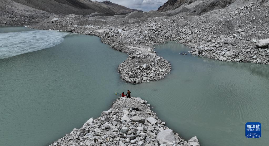 在珠峰海拔約5300米處的冰前湖,科考隊員在取水樣(5月12日攝,無人機照片)。新華社記者 晉美多吉 攝