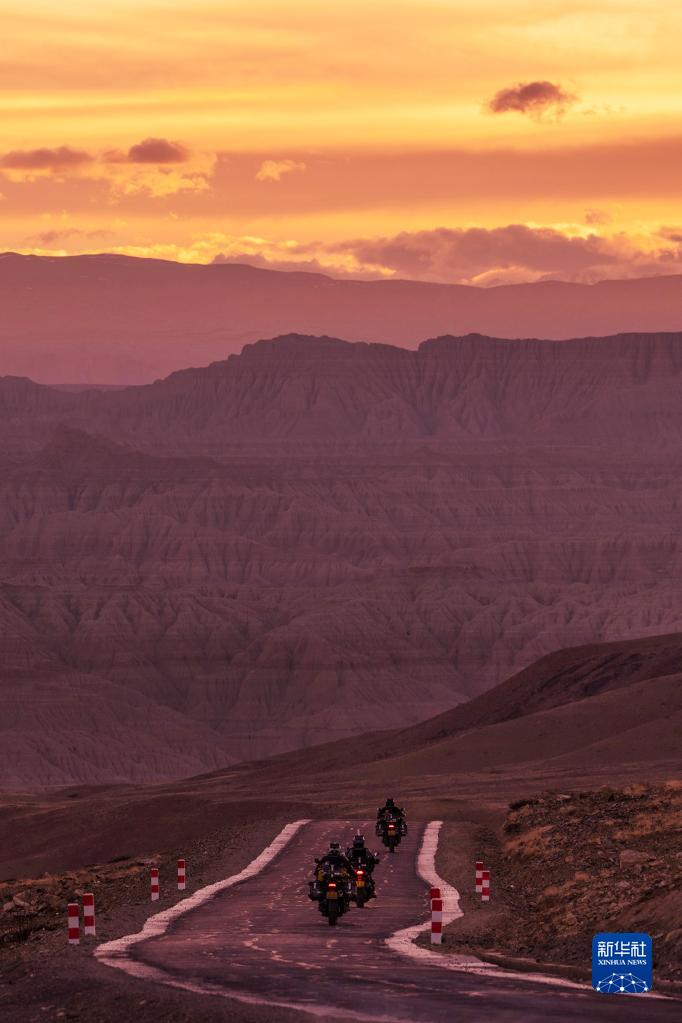 夕陽時(shí)分,三位騎士駕駛摩托車駛向札達(dá)土林(5月25日攝)。新華社記者 費(fèi)茂華 攝