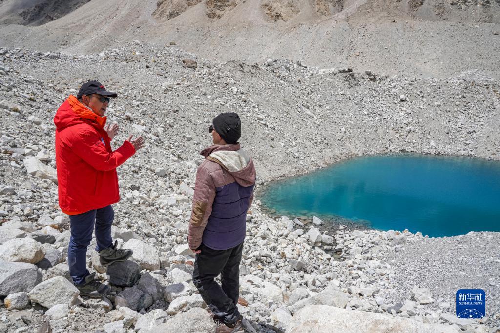 在珠峰海拔約5300米處,中國科學院西北生態(tài)環(huán)境資源研究院副院長康世昌(左)和科考隊員討論冰面湖的形成原因(5月14日攝)。新華社記者 孫非 攝