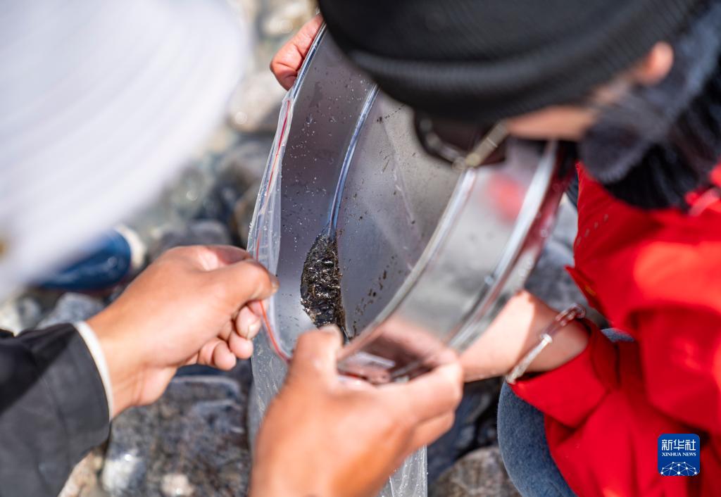 在珠峰登山大本營附近,來自西藏大學生態(tài)環(huán)境學院的科考隊員在收集水生生物樣本(5月22日攝)。新華社記者 孫非 攝