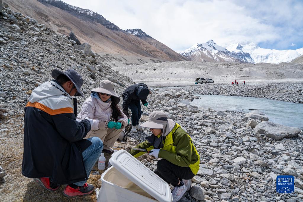 在珠峰登山大本營附近,來自西藏大學生態(tài)環(huán)境學院的科考隊員在進行水生態(tài)調(diào)查(5月22日攝)。新華社記者 孫非 攝