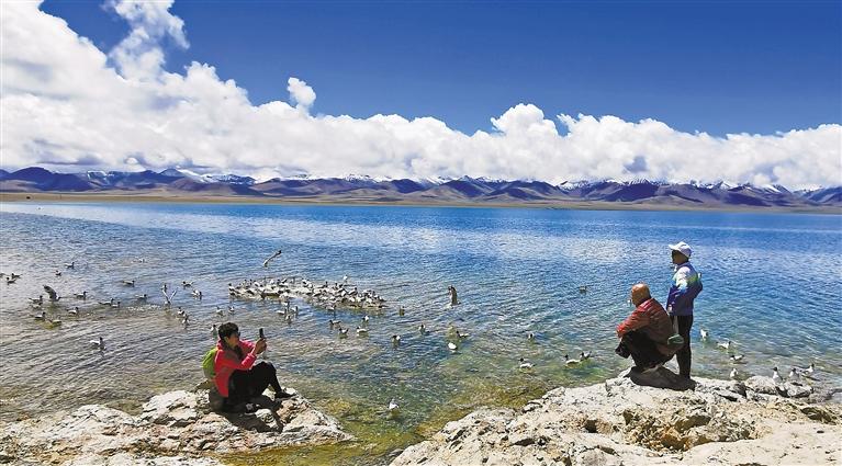 游客在納木錯(cuò)湖畔拍照留影。