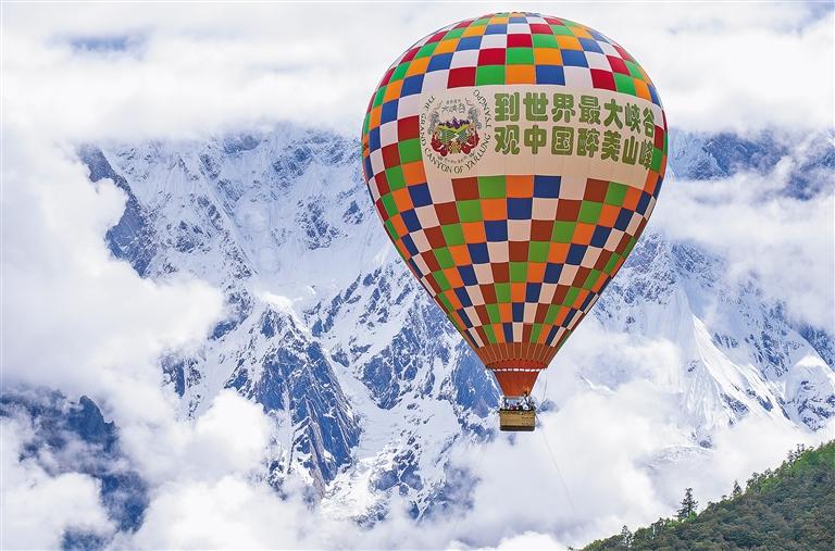 游客在米林市派鎮(zhèn)乘坐熱氣球俯覽雅魯藏布大峽谷。