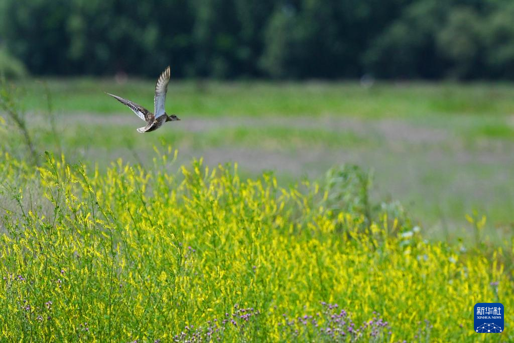 綠頭鴨在拉魯濕地飛翔(7月23日攝)。新華社記者 張汝鋒 攝