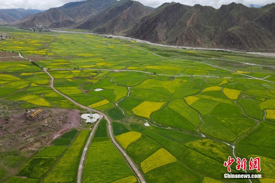 7月24日,航拍西藏堆龍曲沿岸的油菜花田與青稞地。堆龍曲是拉薩河支流,源頭位于念青唐古拉山脈西南,流經(jīng)羊八井、德慶鎮(zhèn),至堆龍德慶區(qū)注入拉薩河干流。近日,西藏堆龍曲兩岸油菜花盛放,呈現(xiàn)出一幅“高原不與四時(shí)同、七月才開二月花”的美麗景象。駕車經(jīng)過(guò)或漫步其間,高原油菜花散發(fā)出陣陣花香,像是“春天的味道”。江飛波 攝