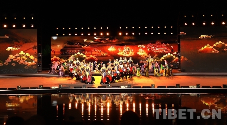 當(dāng)晚開幕式文藝演出共分為序《雪頓新韻》、上篇《相約雪頓》、下篇《心約拉薩》和尾聲《百年雪頓》四部分,整場(chǎng)文藝演出融合歌曲、舞蹈、藏戲、京劇、昆曲、街舞等元素,并以半實(shí)景的舞臺(tái)藝術(shù)形式上演《百年雪頓》等節(jié)目,線上線下呈現(xiàn)了一臺(tái)傳統(tǒng)與現(xiàn)代交相輝映、傳承與創(chuàng)新和諧相融、歷史與未來一脈相承的文藝盛宴。