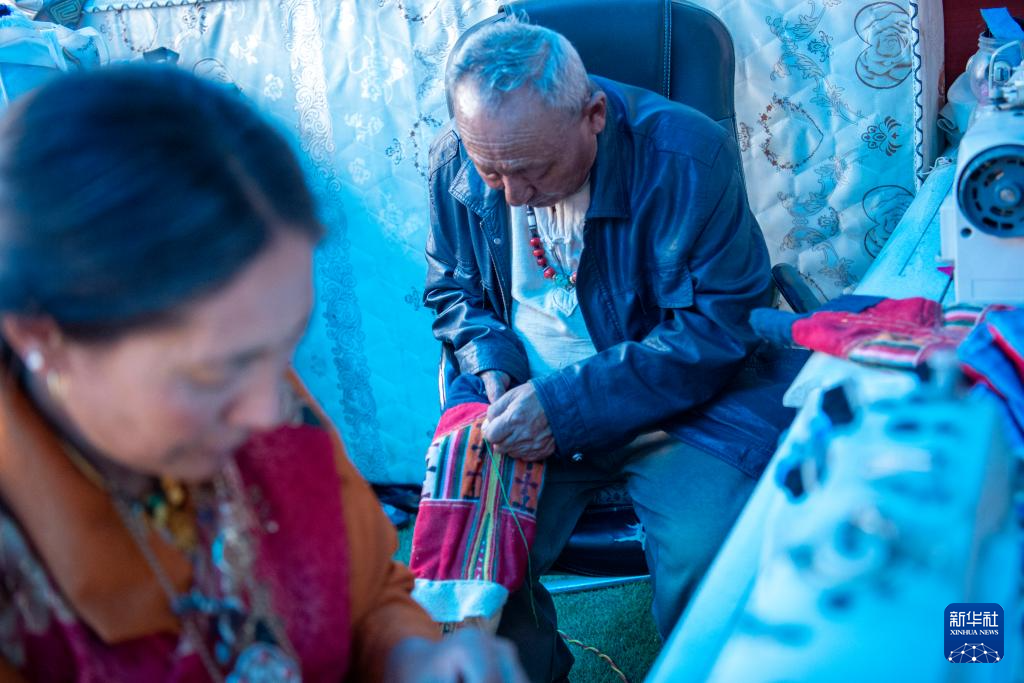 8月27日,努拉老人和妻子玉措正在縫制森郭服飾。(旦增努布攝)