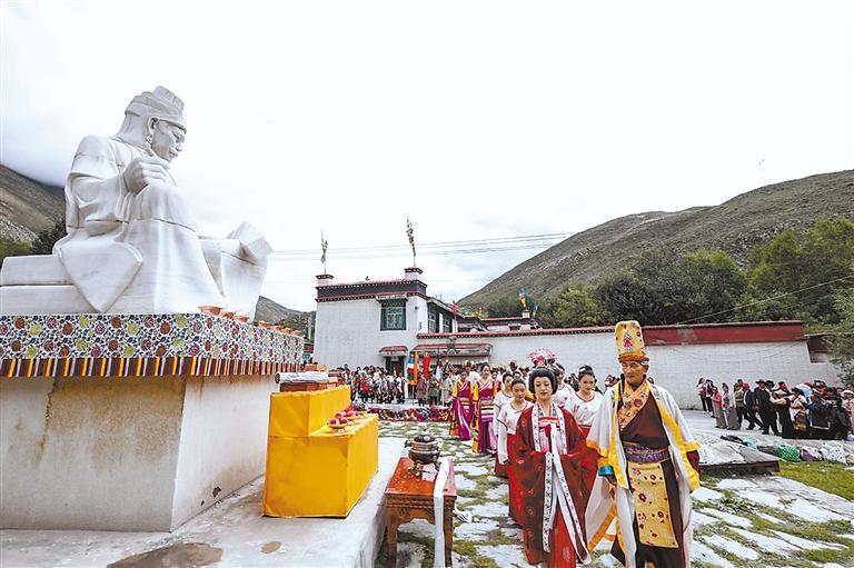 在特色巡游活動(dòng)中,游客跟隨隊(duì)伍共同前往水磨長(zhǎng)廊感受尼木吞巴1300年的歷史文化。