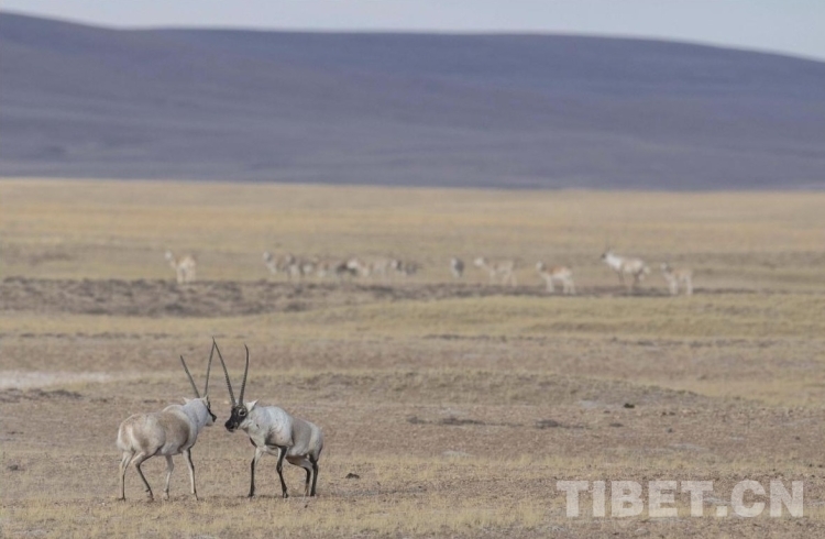 圖為羌塘自然保護(hù)區(qū)內(nèi),正在決斗的兩只強(qiáng)壯的公藏羚羊。 攝影:達(dá)瓦次仁