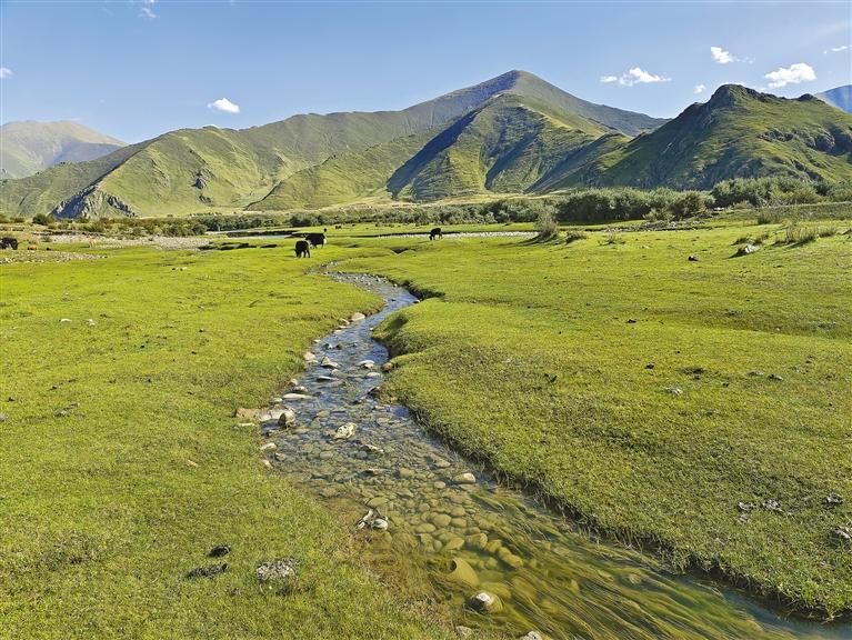 位于布崗村的渠嚓埠濕地,因其眾多島嶼分割水系形成淺灘,讓河水經(jīng)過(guò)時(shí)變得平緩,在陽(yáng)光照射下水溫升高,綠樹(shù)成蔭、草地肥美,是戶外水上運(yùn)動(dòng)的絕佳場(chǎng)所,游客在享受淺灘漂流的舒適中感受大自然的魅力。草地像是一幅巨大的毯子又寬又平,牦牛在草地上悠閑覓食,黑色點(diǎn)點(diǎn),將草地點(diǎn)綴得十分美麗。