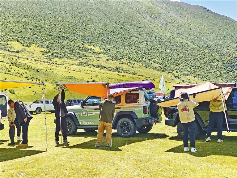 覺(jué)丹峰的對(duì)面是一大片平整的壩子,在志愿者的引導(dǎo)下,車友們將車輛有序停放好,迫不及待地開(kāi)始搭設(shè)帳篷、側(cè)邊天幕等露營(yíng)裝備。