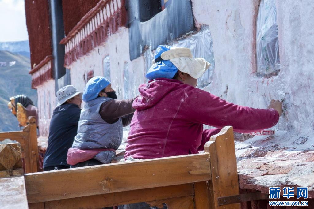 10月18日,布達(dá)拉宮“美容師”在噴灑涂料。新華網(wǎng) 柑丹鴦琦 攝 ??