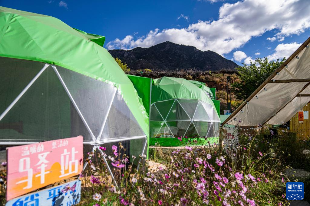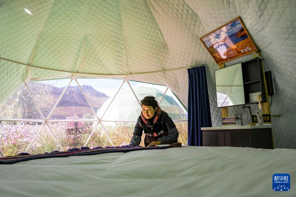 工作人員在西藏芒康縣如美鎮(zhèn)拉烏村一座星空帳篷內(nèi)收拾床鋪(10月20日攝)。新華社記者 孫非 攝 ??